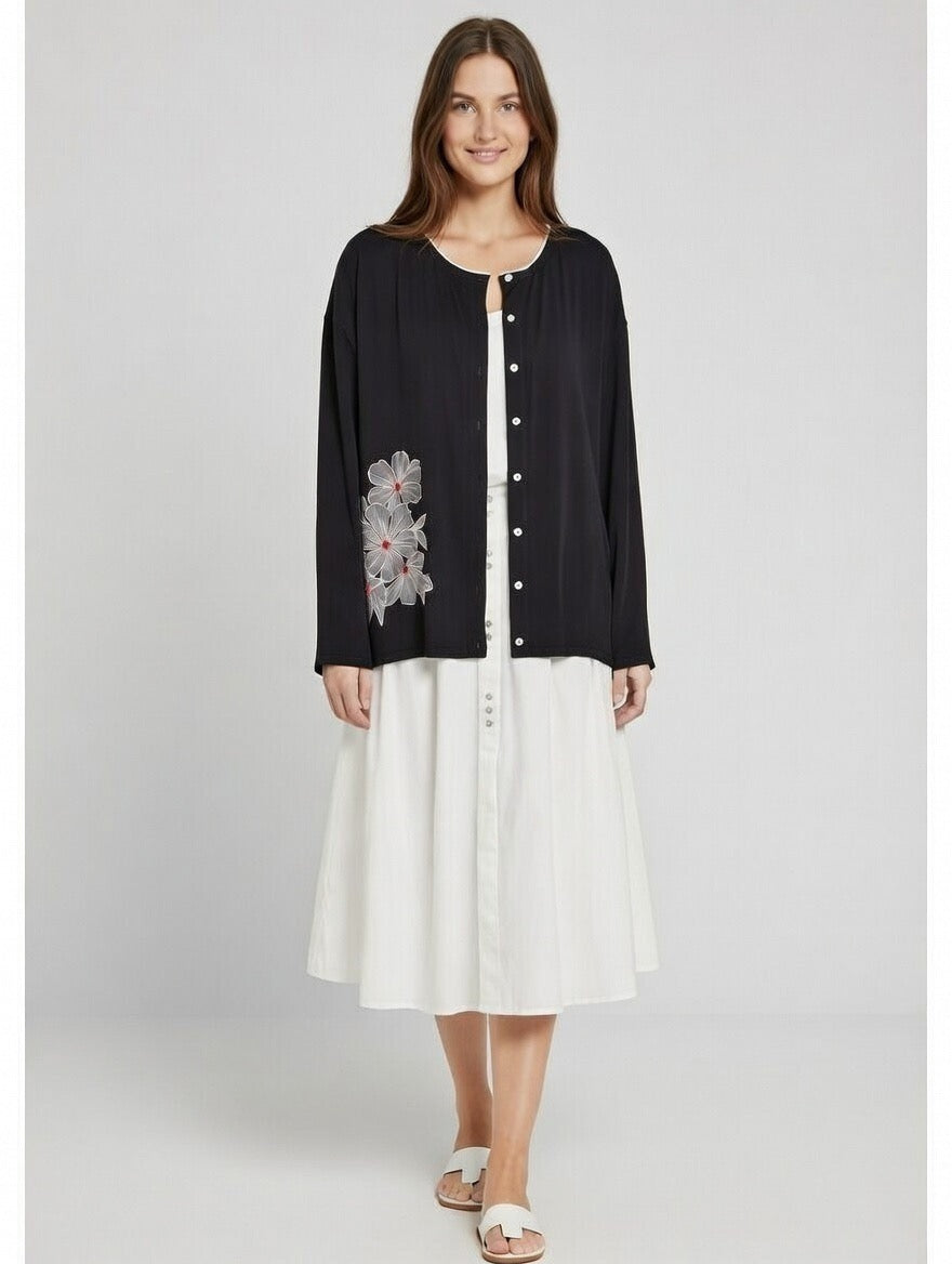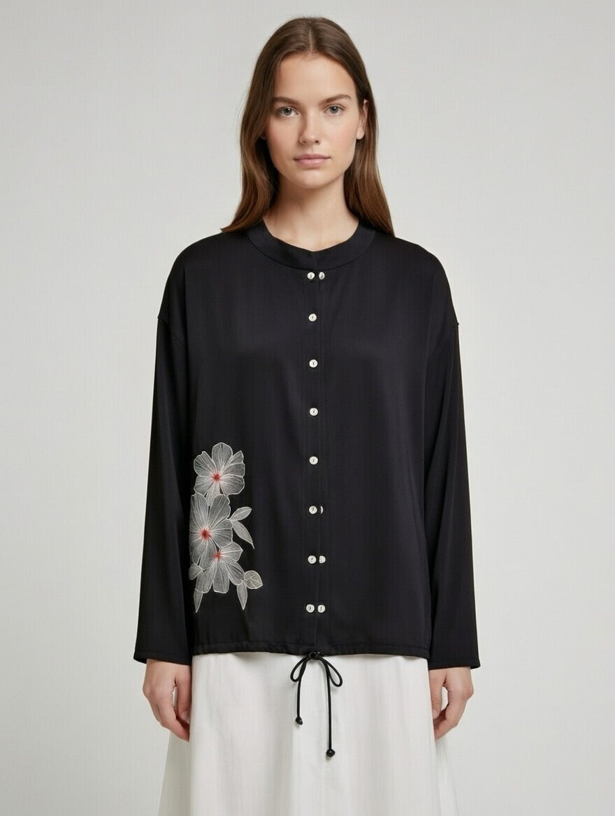 Casual comfort meets polished style with this versatile t-shirt top. Featuring a classic button-down front for easy layering and adjustable styling, paired with a tie bottom that cinches for a flattering, customizable fit. Perfect for dressing up or down, this piece transitions seamlessly from day to night. The relaxed silhouette offers everyday wearability while the thoughtful design details elevate your look.