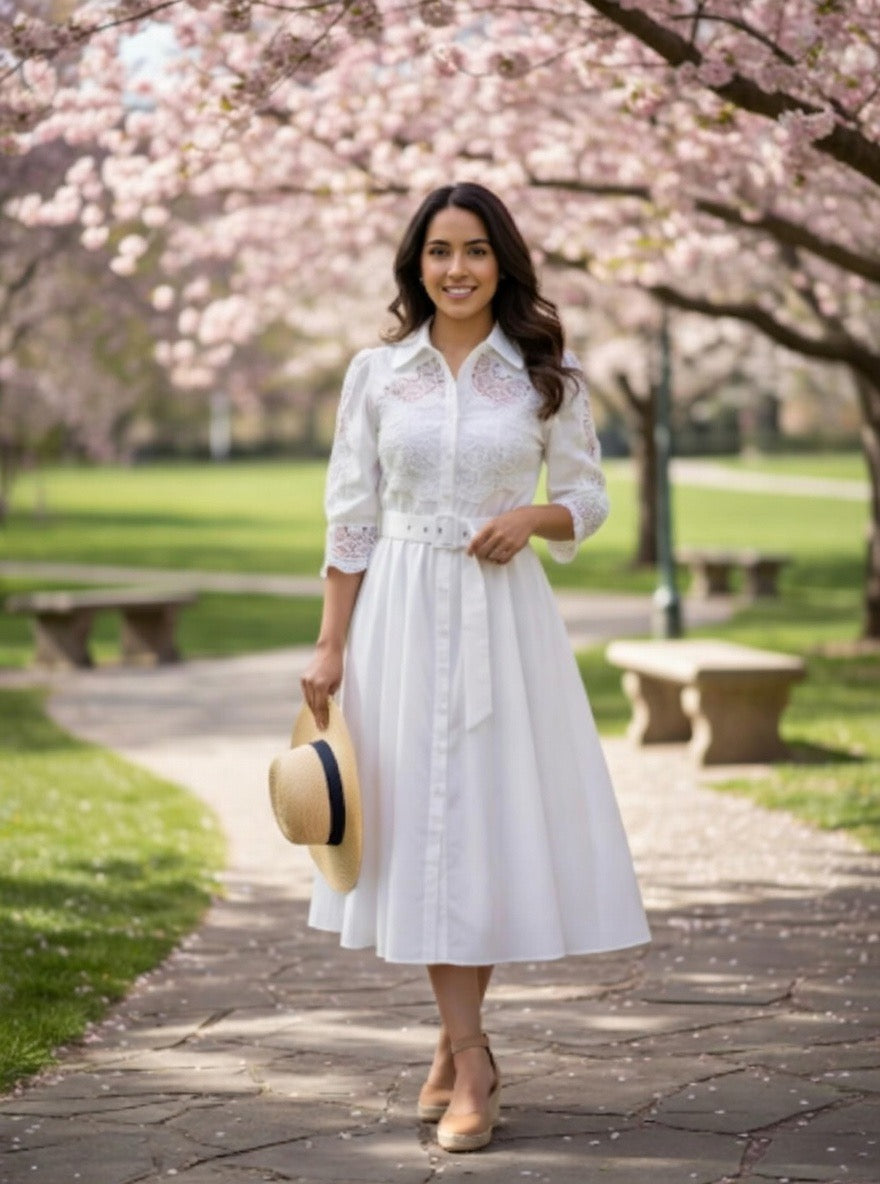Twirl into elegance with this charming cream dress, where delicate lace details meet a crisp collar for a look that's both sweet and sophisticated. Perfect for brunch dates, garden parties, or whenever you want to feel effortlessly put-together. The lace adds a touch of romance while the structured collar keeps things polished and chic. A versatile wardrobe essential that transitions beautifully from day to night.