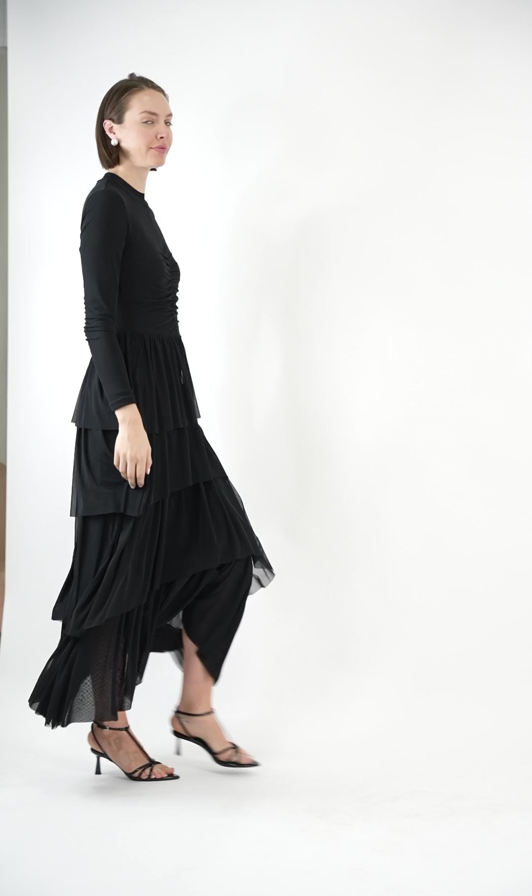 Crafted from stretch mesh, this fully lined dress offers both comfort and elegance. Featuring intricate midchest ruching, fitted sleeves, and a tiered skirt design, it exudes timeless sophistication. A must-have for any fancy occasion.