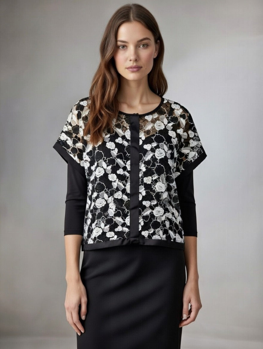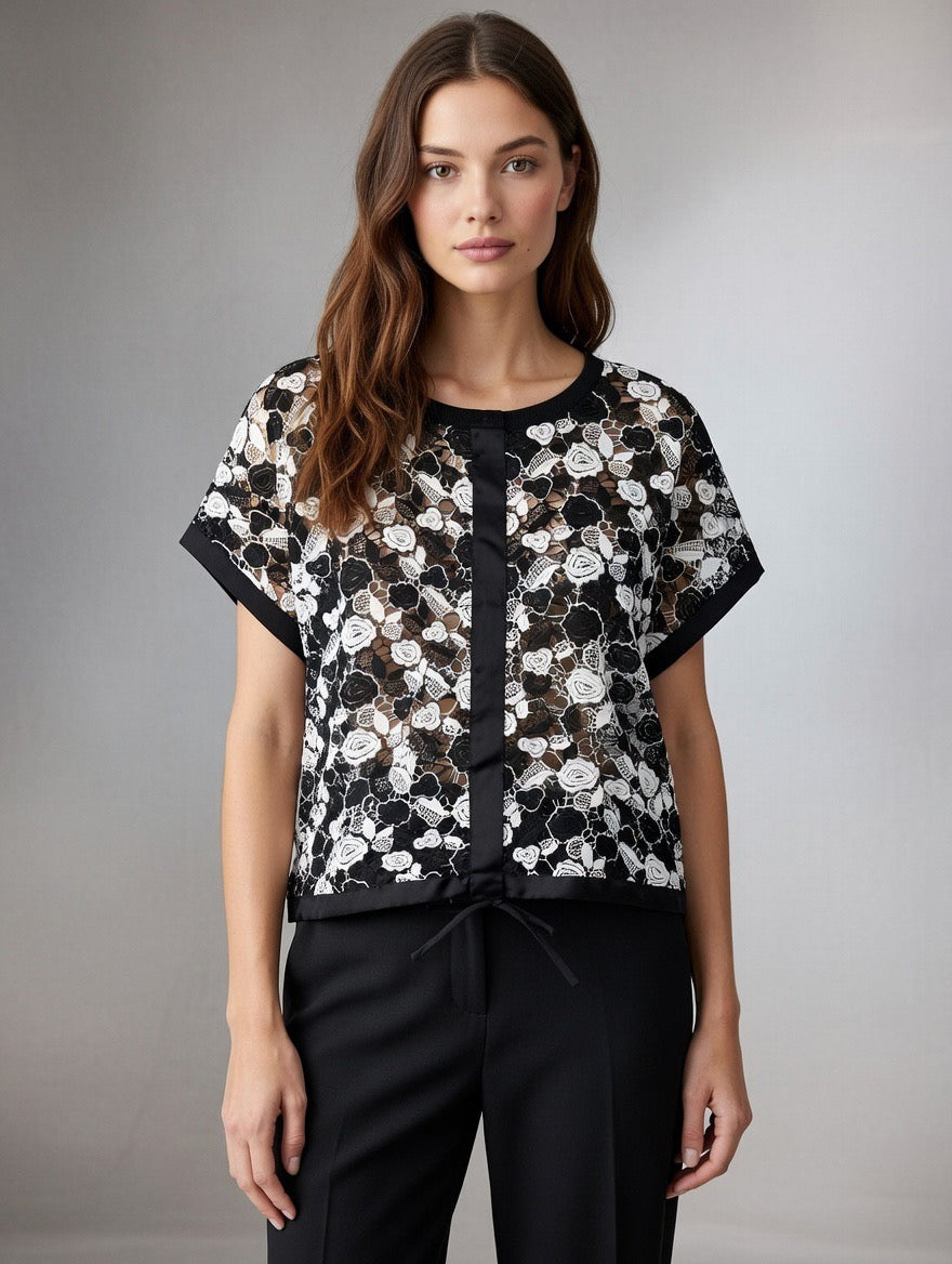 Effortless style meets practical design with this black and white top. The snap front closure allows for easy layering and quick adjustments, while the drawstring bottom provides a customizable fit that flatters any silhouette. Perfect for casual outings or relaxed weekends, this versatile piece transitions seamlessly from day to night.