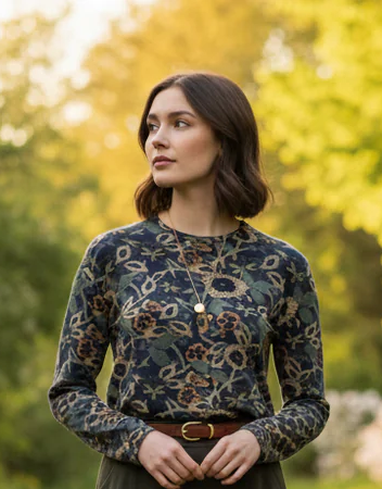 Featuring a stunning abstract print that blends ornate baroque and floral elements, this shirt shines in rich jewel tones of navy blue, deep olive green, and muted gold. The classic crew neckline and full-length sleeves make it a perfect, versatile piece that respects your style standards without compromising on beauty.