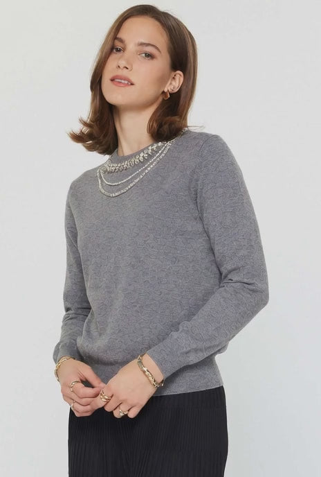 Elevate your everyday wardrobe with this refined long sleeve knit pullover. The classic crew neckline is enhanced with an elegant faux layered crystal detail that adds a touch of understated glamour. Constructed with quality knit fabric, this piece features ribbed cuffs and hem for a polished, tailored silhouette. Perfect for layering or wearing solo, it transitions seamlessly from day to evening occasions.