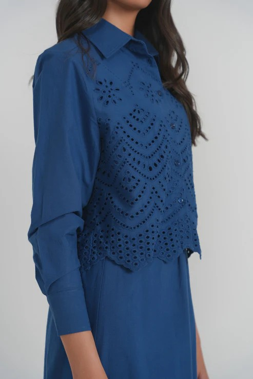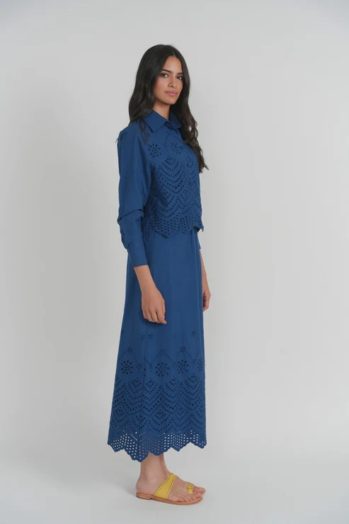 The Rhodes set is crafted from airy cotton with intricate eyelet embroidery throughout. Designed with a relaxed yet polished silhouette, it features a button-front closure, long sleeves with buttoned cuffs, and a softly structured collar. The hem hits at the natural waist, finished with scalloped embroidery that adds texture and interest. Lightweight and breathable, it's an elevated everyday piece that pairs effortlessly with the matching skirt or worn on its own.