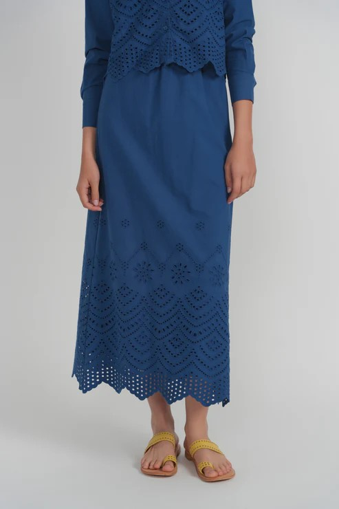 The skirt is made from matching embroidered cotton and designed for ease and movement. It features a comfortable elastic waistband for a flexible fit, flowing into a softly flared, full-length silhouette. The skirt drapes loosely through the hips and legs, creating an effortless, feminine shape while maintaining comfort. Finished with embroidered detailing at the hem, it's an easy pull-on style that balances structure with softness.