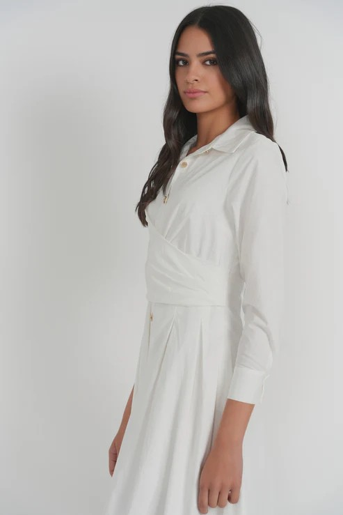 Crafted from a smooth, lightweight fabric with a crisp hand, the Casablanca Dress features a clean button front and long sleeves balanced by a gently flowing skirt. Subtle wrap detailing through the bodice adds dimension while maintaining a composed silhouette. Designed to move effortlessly, this piece offers a modern take on classic dressing with an understated, elegant finish.